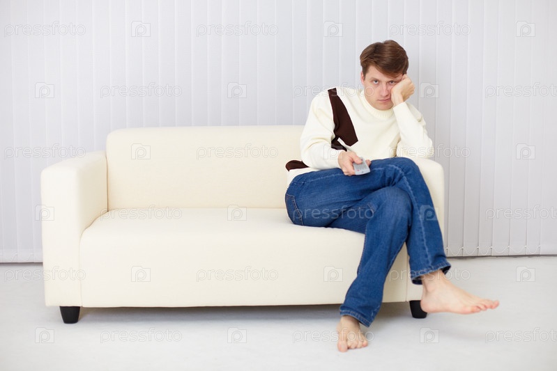 Парень, сидя на диване с пультом в руках, смотрит телевизор
