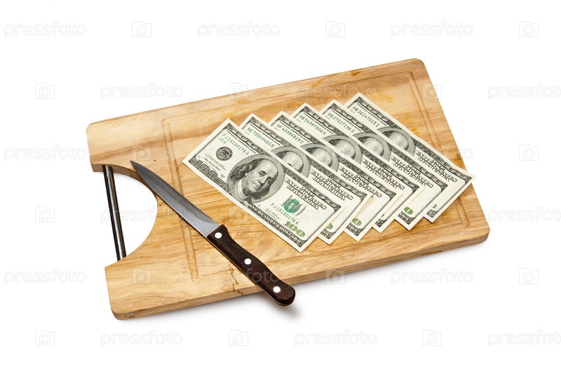 Стодолларовые купюры, аккуратно сложенные на разделочной доске и нож