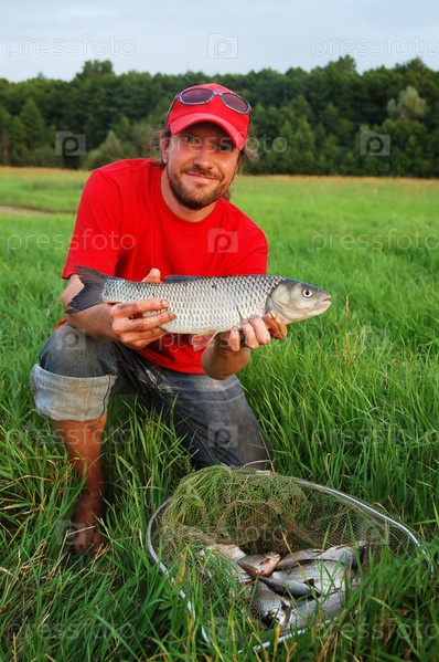 Рыбак с рыбиной в руках на берегу реки