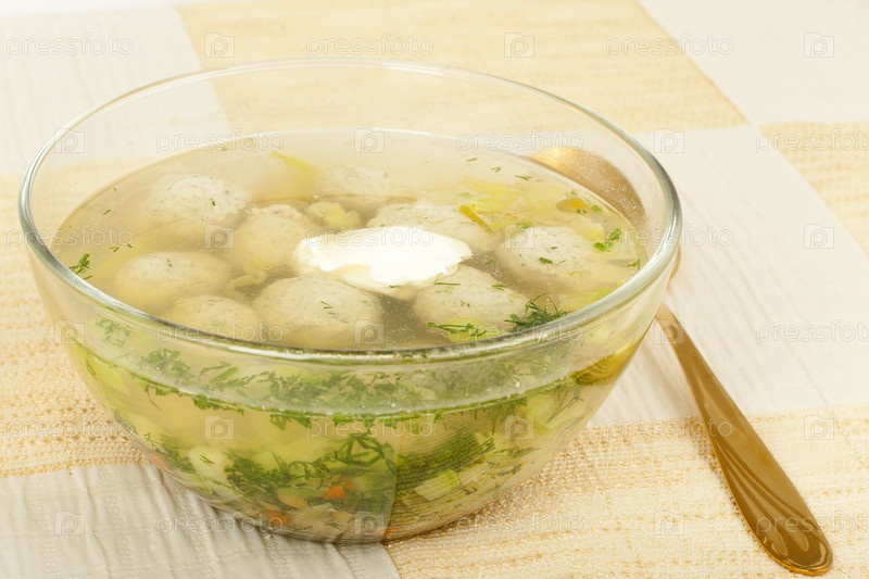 Куриный суп с овощами и фрикадельками в стеклянной миске