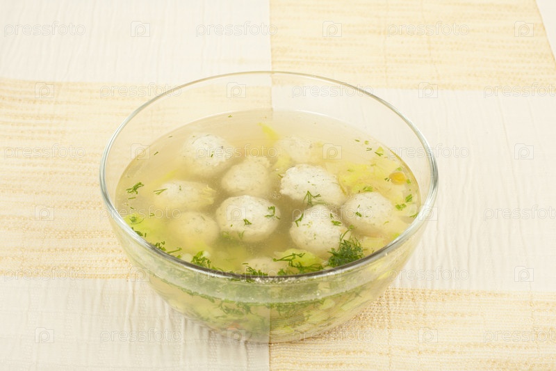 Куриный суп с овощами и фрикадельками в стеклянной миске