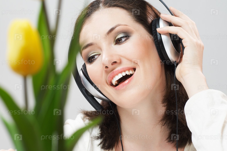 Девушка в наушниках на синем фоне