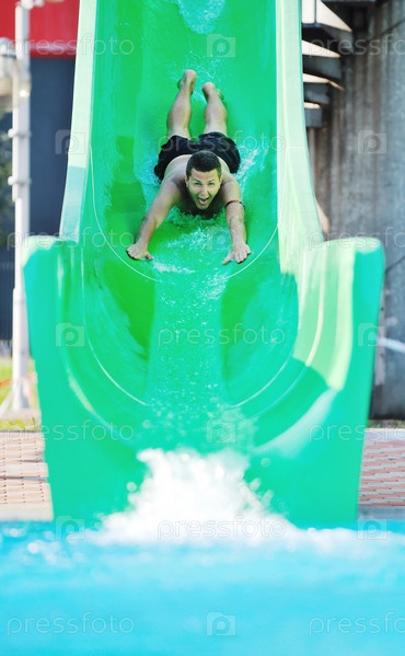 Счастливый парень катается на водной горке в открытом плавательном бассейне