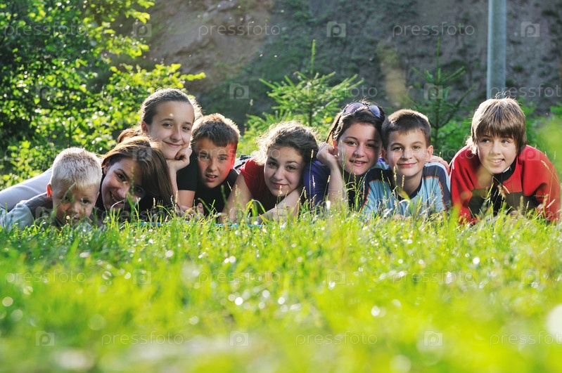 Группа счастливых детей отдыхает на природе в солнечный день
