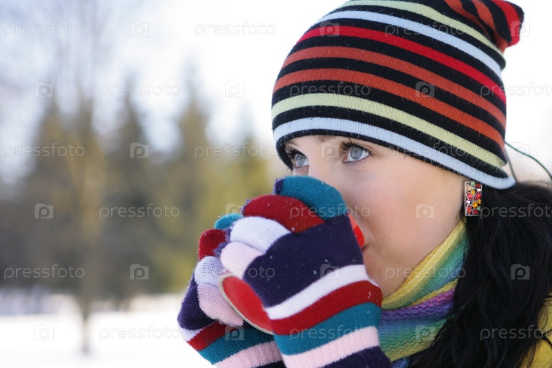 Девушка в шапке и перчатках зимой пьет из красной кружки