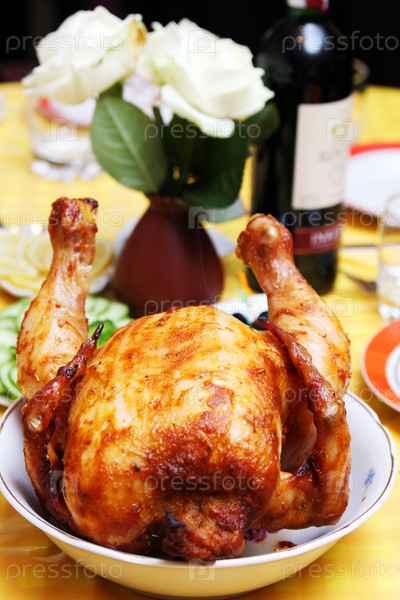Целый жареный цыпленок со вкусной корочкой на праздничном столе