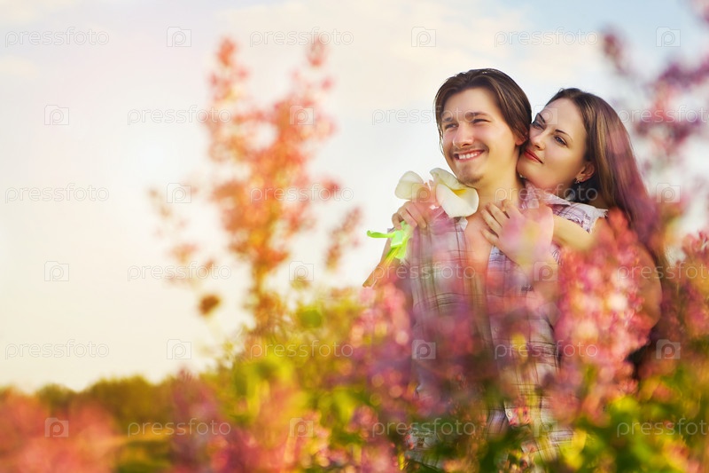 Двое влюбленных обнимаются в летнем парке