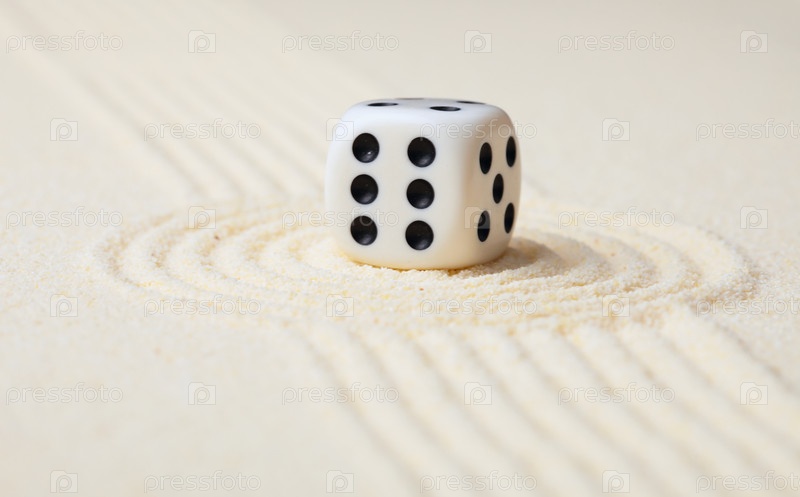 Игральный белый кубик с черными точками на песке