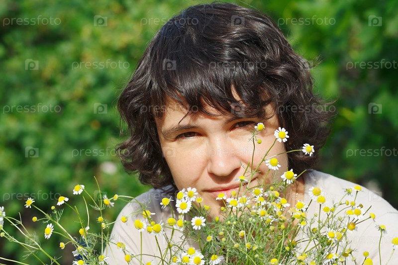 Молодая женщина среди летних ромашек на свежем воздухе
