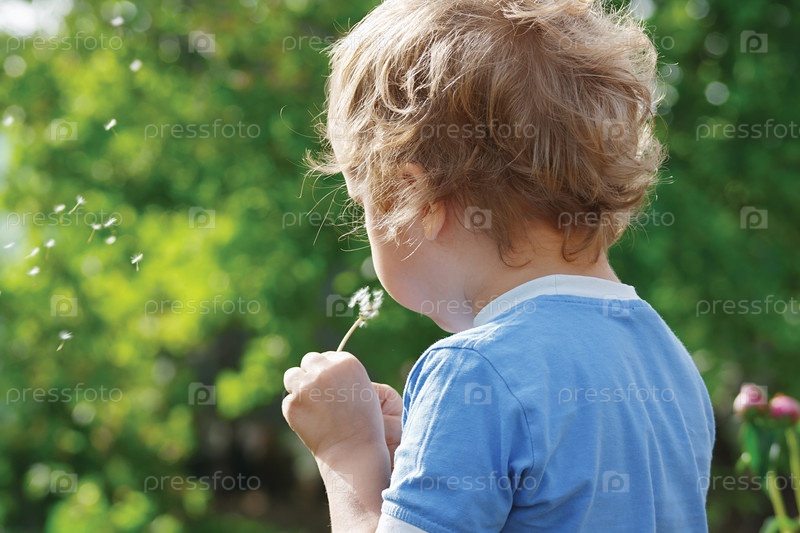 Маленький милый мальчик дует на одуванчик на свежем воздухе