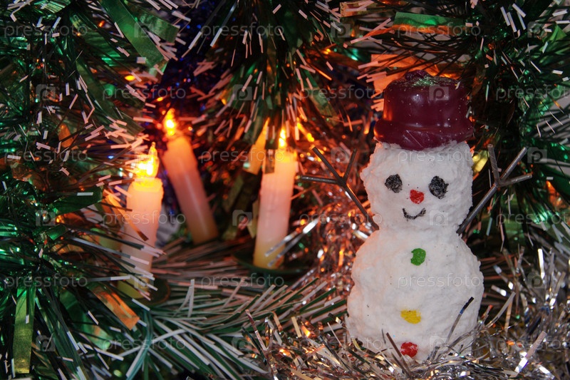 Фигурка снеговика на фоне новогодней мишуры