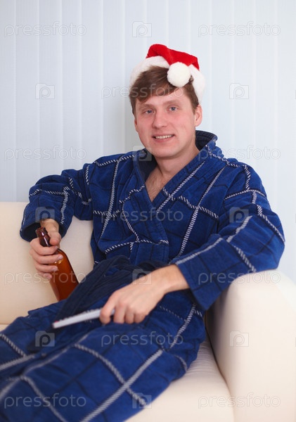 Парень в домашнем халате, рождественском красном колпаке и с бутылкой пива
