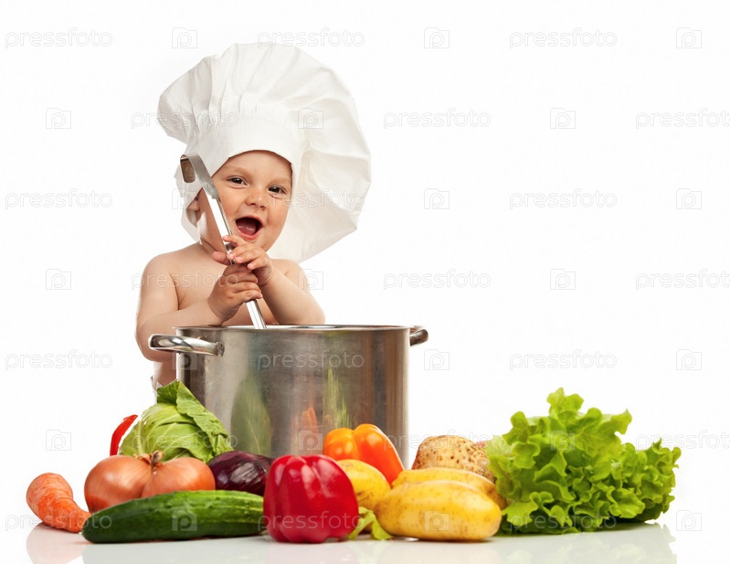Маленький мальчик в колпаке шеф-повора с кастрюлей и овощами