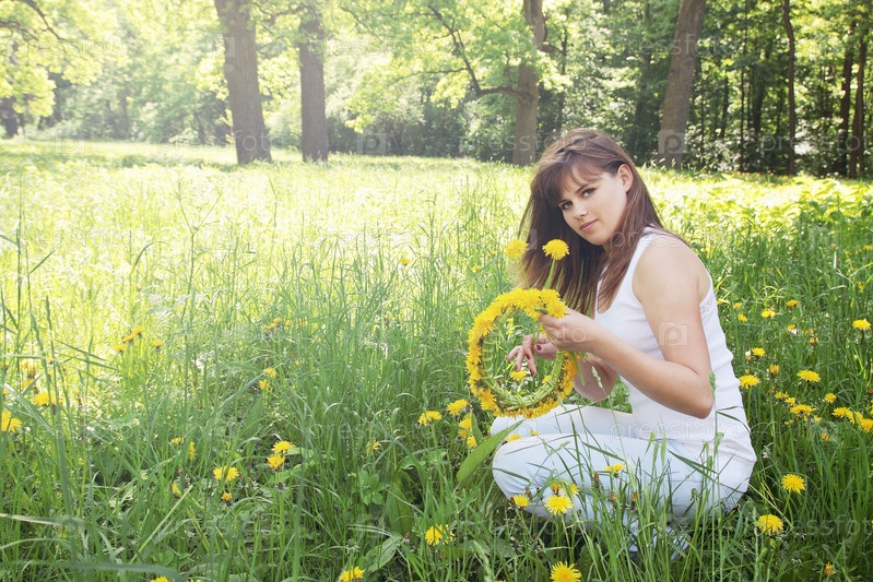 Красивая молодая женщина плетет венок из одуванчиков