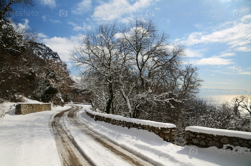 Заснеженная дорога в горной местности