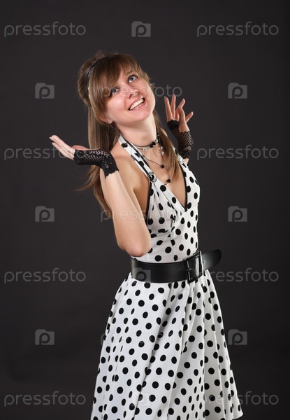 Танцующая девушка в белом платье в горошек на темном фоне