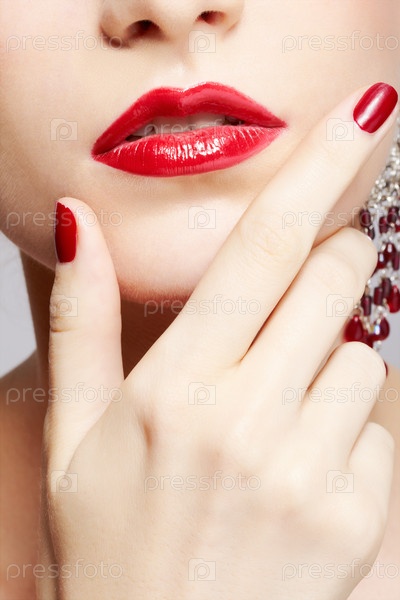 Фрагмент красивого женского лица с ярко-красными губами и рука с маникюром
