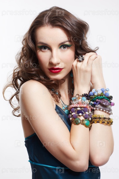 Красивая женщина в голубом платье с дорогими браслетами