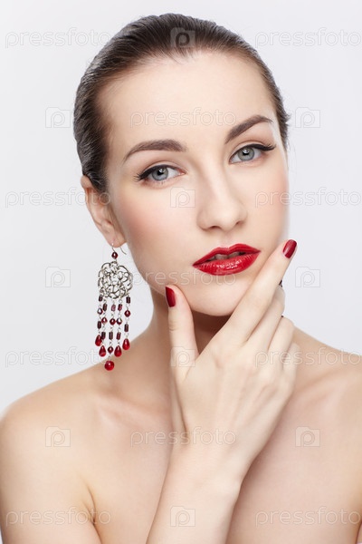 Красивая брюнетка с дорогими украшениями на белом фоне