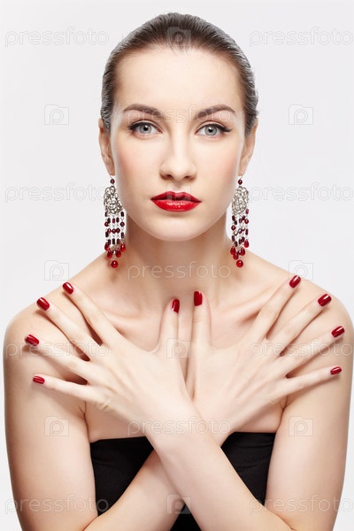 Красивая брюнетка с дорогими украшениями на белом фоне