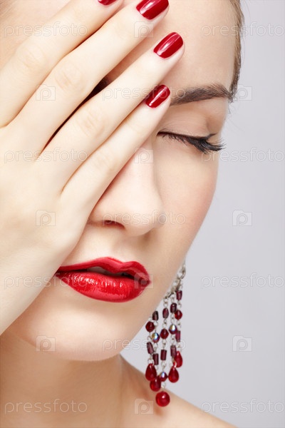 Портрет красивой брюнетки в ярких серьгах, закрывающей половину лица рукой