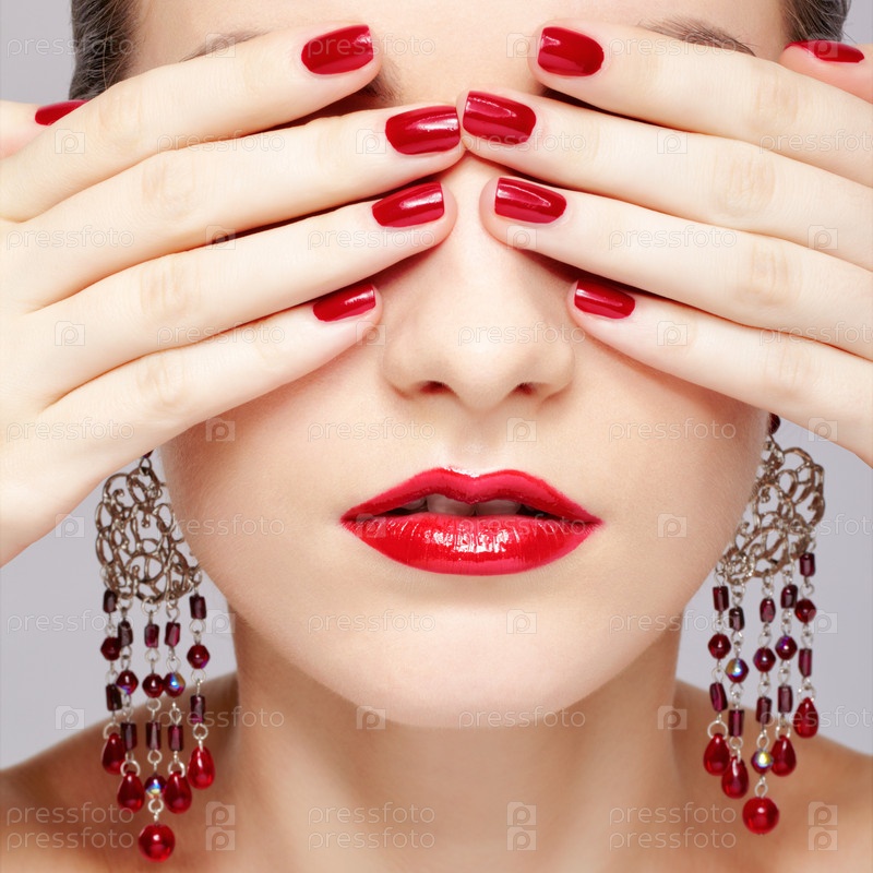 Красивая женщина в ярких серьгах закрывает глаза ухоженными руками
