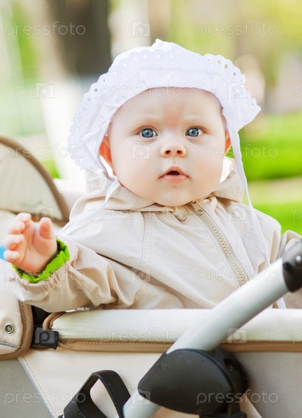 Маленькая девочка в детской коляске в парке