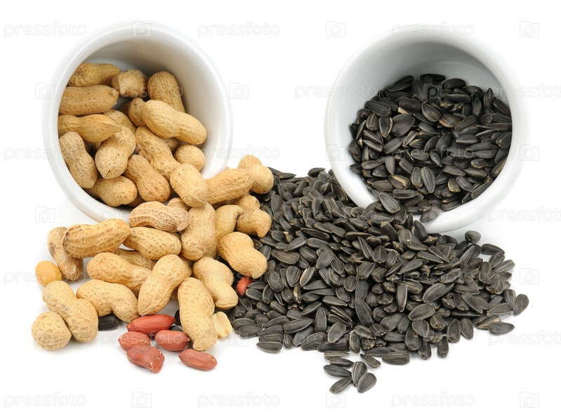 Арахис и семена подсолнечника, изолировано на белом фоне