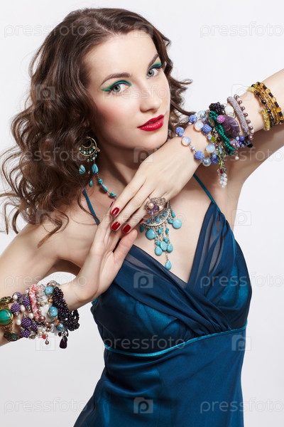 Красивая молодая брюнетка в синем платье, кольцах, браслетах, серьгах и бусах на сером фоне