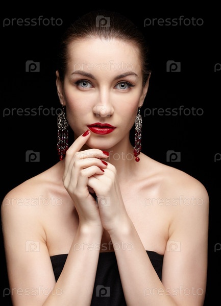 Красивая молодая брюнетка с серьгами прикасается к своему лицу рукой с маникюром