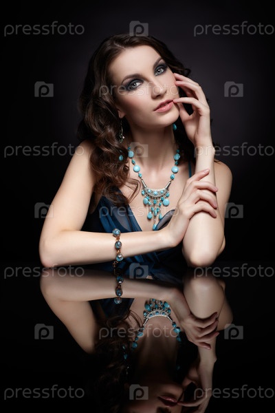 Красивая молодая брюнетка в ювелирных изделиях сидит за зеркальным столом