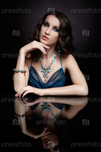 Красивая молодая брюнетка в ювелирных изделиях сидит за зеркальным столом