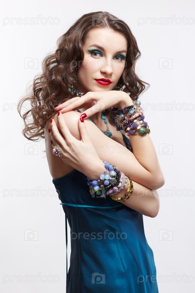 Красивая молодая брюнетка в синем платье, кольцах, браслетах, серьгах и бусах на сером фоне