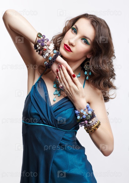 Красивая молодая брюнетка в синем платье, кольцах, браслетах, серьгах и бусах на сером фоне