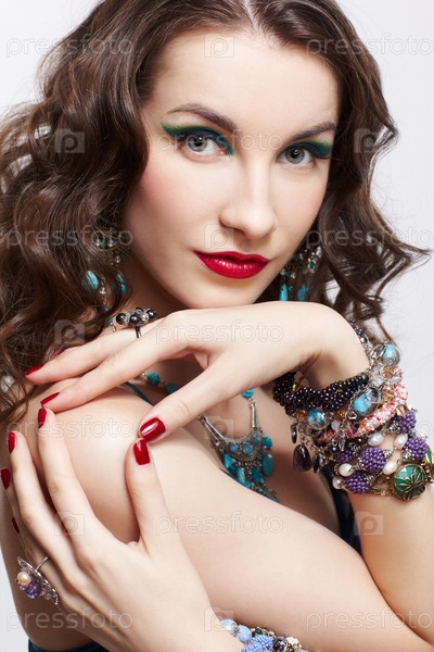 Красивая молодая брюнетка в синем платье, кольцах, браслетах, серьгах и бусах на сером фоне