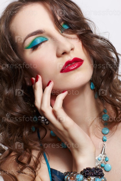 Красивая молодая брюнетка в синем платье, кольцах, браслетах, серьгах и бусах на сером фоне