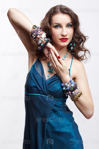 Красивая молодая брюнетка в синем платье, кольцах, браслетах, серьгах и бусах на сером фоне