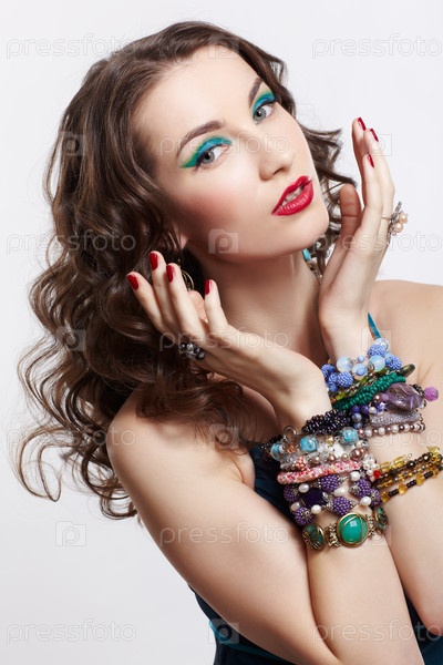 Портрет молодой красивой брюнетки в голубом платье в кольцах, серьгах, браслетах и бусах