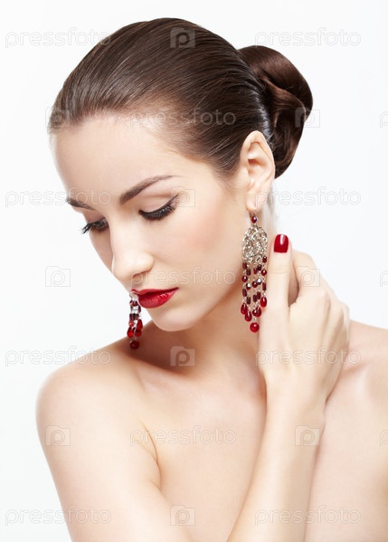 Портрет ухоженной красивой брюнетки в серьгах с ярким макияжем и маникюром