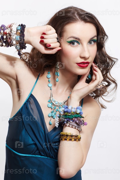 Портрет молодой красивой брюнетки в голубом платье с множеством ювелирных украшений
