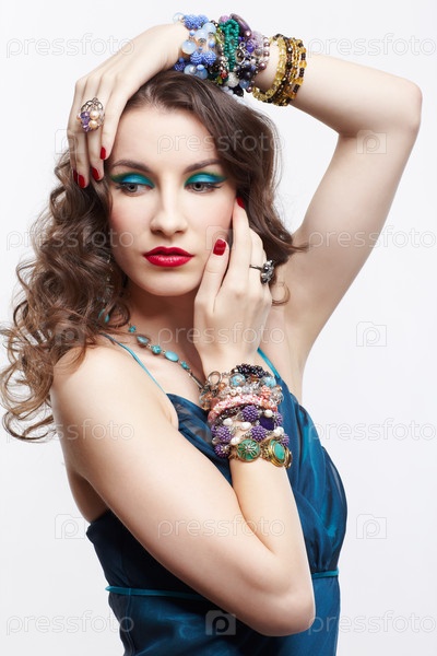 Портрет молодой красивой брюнетки в голубом платье с множеством ювелирных украшений