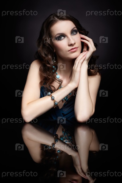 Портрет молодой красивой брюнетки с ювелирными украшениями на темном фоне с отражением