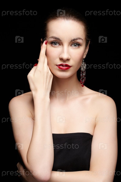 Красивая молодая брюнетка с серьгами прикасается к своему лицу руками с маникюром