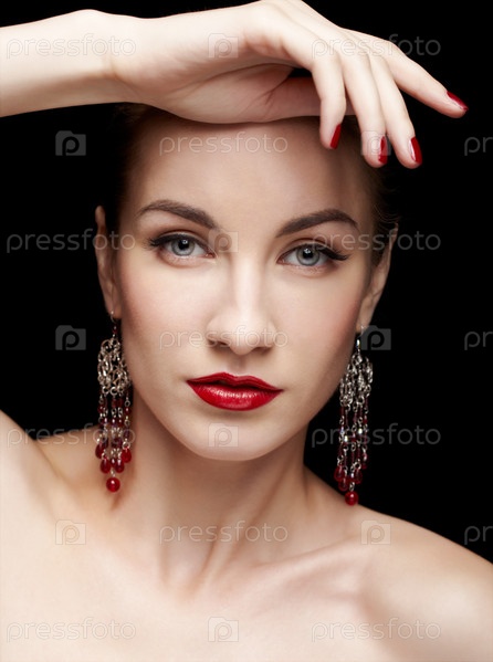 Красивая молодая брюнетка с серьгами прикасается к своему лицу руками с маникюром