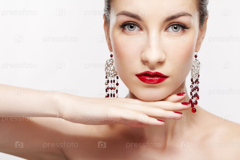 Портрет ухоженной красивой брюнетки в серьгах с ярким макияжем, маникюром и рукой у подбородка