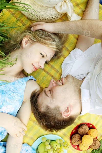 Молодая пара лежит лицом к лицу на пикнике