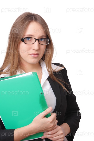 Красивая, строгая деловая женщина на белом фоне