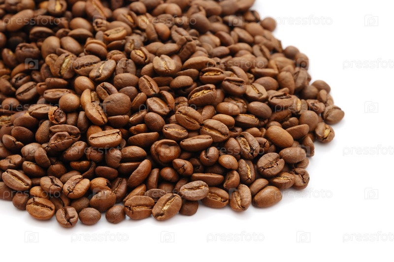 Куча кофейных зерен на белом фоне