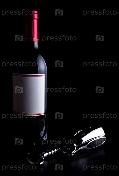 Бутылка вина и штопор, изолированные на черном фоне
