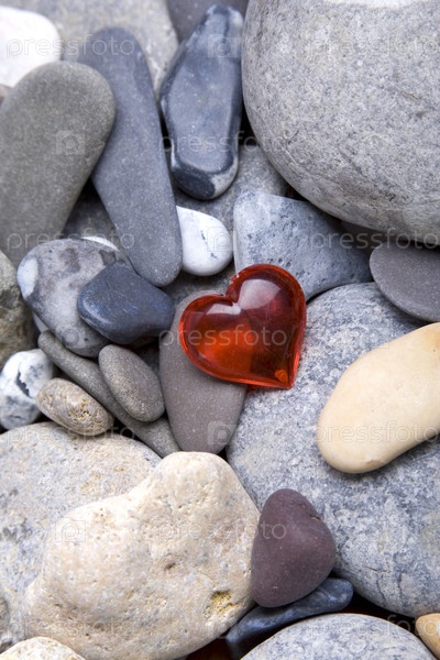 Разные гладкие речные камушки и пластмассовое сердечко